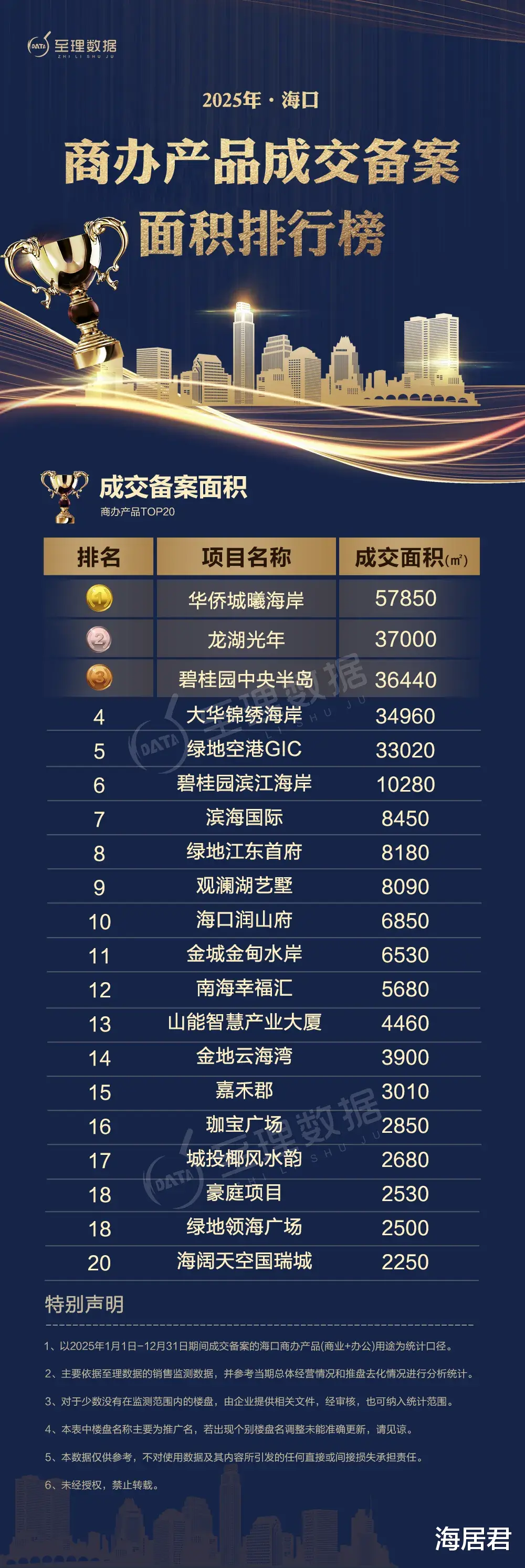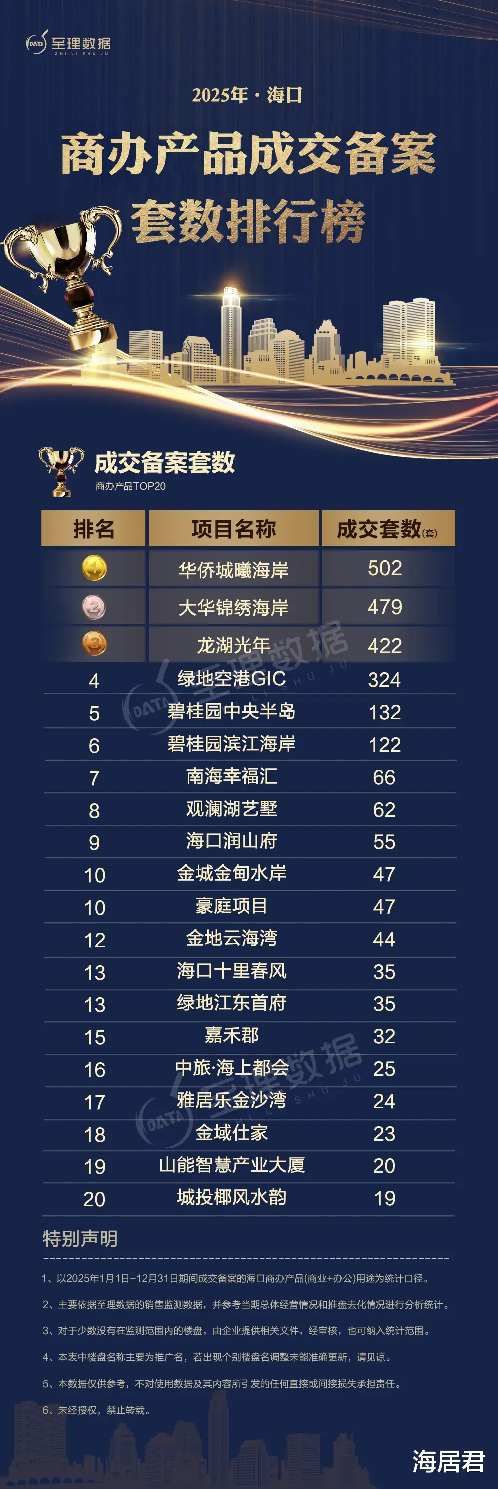 2025年海口商办产品成交套数TOP20楼盘共成交2515套,华侨城曦海岸成交502套,首次摘得年度销冠;大华锦绣海岸不仅商品住宅夺得销售亚军,其商办产品成交479套,夺得商办销售亚军。