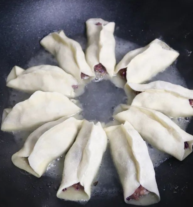 6、锅烧热,在锅底均匀地涂上一层油。将包好的饺子整齐地放入锅中,用小火慢慢煎至底层微黄,然后沿着锅边慢慢加入适量的水(注意,水量必须没过饺子的一半)饺子馅料),盖上盖子,开中小火继续煮约5分钟,直至水份完全蒸发,整个煮制过程完成。 “加水的步骤很巧妙,可以让面团更加柔韧,饺子也熟了。”