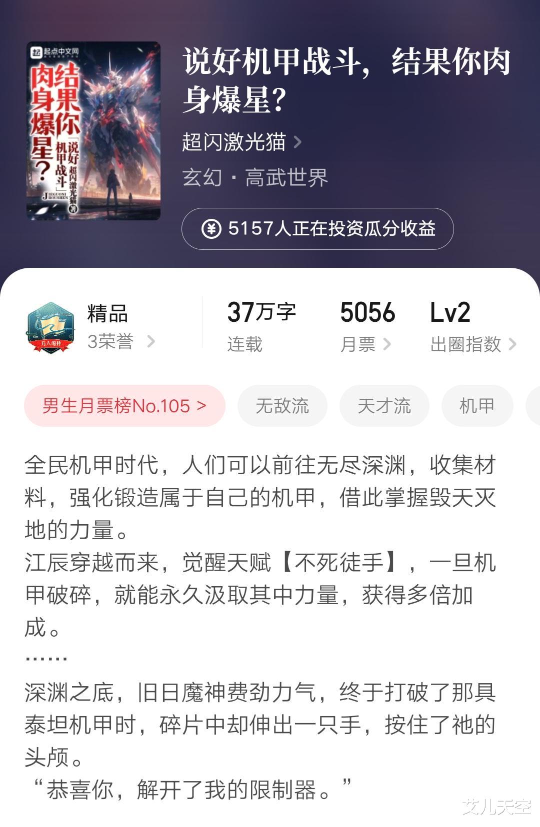 2、超闪激光猫的机甲文万订徽章就位今天也有万订新增作品,就是超闪激光猫的这本机甲文《说好机甲战斗,结果你肉身爆星?》,这是起点第1158本拿到万订徽章的小说。