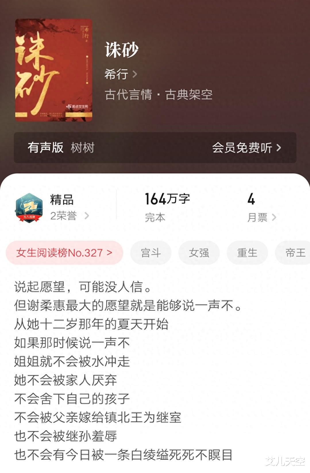 希行的这本《诛砂》是2015年11月完结的老书,到现在八年多了。它的万订也是今年起点女频第一本突破万订的作品,去年起点女频新增万订只有一手之数,今年还能不能延续去年的成绩还真不好说。