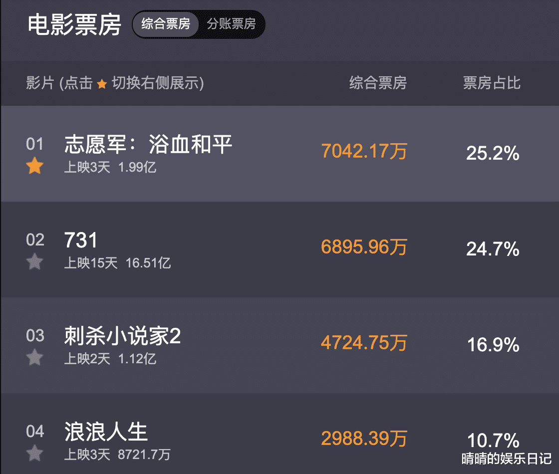 最好的《志愿军:浴血和平》目前票房也才刚刚2亿,而第二名居然是上映半个月之久的电影作品《731》。