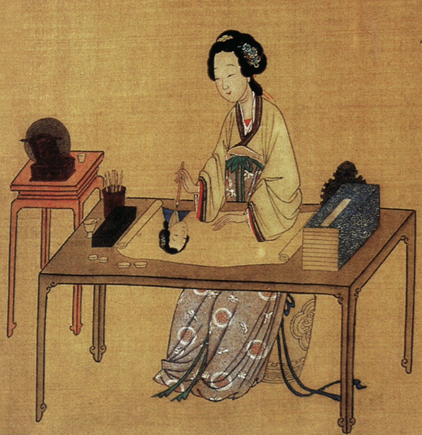 ——宋代杭州歌伎周韶(周韶善品茗、工诗文。书法、品茶大家蔡襄,曾在斗茶中败于她。杭州知州陈襄设宴款待苏颂时,苏颂指着廊下的白鹦鹉,对周韶说:“若能以它为题吟出好诗,我就替你求情脱去妓籍。”周韶身着素服,即兴赋诗:“陇上巢空岁月惊,忍看回首自梳翎。开笼若放雪衣女,长念观音般若经。”众人喝彩,周最终脱籍。苏轼在场,感慨“固知杭人多惠(慧)也”),性情恬淡高远、潇洒超逸,有超越世俗的境界。她适合手持茶具,先暂时与陶学士(指宋代才子陶谷。他曾得党进的家姬。某天以雪水烹茶,问:“党家有如此风味吗?”家姬答:“他是粗人,只知在销金帐下浅斟低唱,饮羊羔美酒,哪有这种风味?”后陶学士代指风雅之士)相伴,在驿馆煮雪烹茶,之后再诵读《观音般若经》;最终与蔡襄一起斗茶品茗。