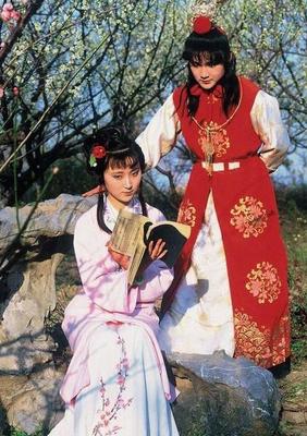且说,宝玉入大观园后每日做些什么?“只和姊妹丫鬟们一处,或读书,或写字,或弹琴下棋,作画吟诗,以至描鸾刺凤,斗草簪花,低吟悄唱,拆字猜枚,无所不至,倒也十分快意。”散漫久了,这个富贵少爷无聊起来,小厮茗烟为了让他开心,买了一堆野史外传。这一天,宝玉正在园中看《会真记》,书里看到“落红成阵”,身边亦有落英缤纷。宝玉一向怜香惜花,兜了花瓣儿抖在沁芳闸水池内。这时候,黛玉来了。你看,时间刚刚好,早春三月的大观园,随风飘落的花瓣儿,肩担花囊手持花帚的神仙似的妹妹,在风光旖旎中飘然而至。二人并肩坐在桃花树下读诵书卷,十里春风,花飞花落,豆蔻年华的少年,冰雪聪明的少女,他们沉浸于书中的箴言妙语,也沉浸于纯真美好的青春时光。宝玉用书里的话逗黛玉:“我就是个‘多愁多病的身’,你就是那‘倾国倾城的貌’。”这可不得了,黛玉说他欺负自己,宝玉急了,赌咒发誓地说自己不是有心欺负她,否则就被癞头龟吃了变成大王八。黛玉被他逗笑了,也用书里的话骂他:“呸!原来也是个‘银样蜡枪头’。”唉,看到这,谁能不会心微笑?此时的宝黛二人,如那三月春山般青葱、诗意,两小无猜,心有灵犀,此时此刻的他们,无疑,是幸福的,无关情爱,无关风月,那是偏安于大观园一隅遗世独立的短暂青春啊!仿佛夹在这破烂人间的精致书签,瞬息芳华染醉那个腐朽的时代和没落的家族。