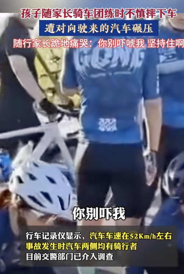 父亲的双手颤抖着,试图去抚摸孩子的脸颊,仿佛这样就能唤回孩子的生命,可孩子的耳部和头部早已开始渗出鲜血。父亲的哀求只能在空中回荡,没有任何回应。一旁的骑友见状,试图安慰这位悲痛欲绝的父亲:“别太着急了,孩子已经……”然而,这些话语却像是一把把利刃,刺进了父亲的心中。