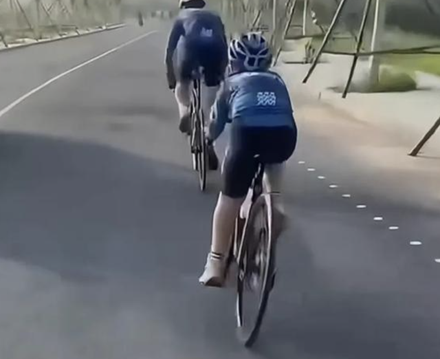 以他儿子的身高和臂展还有力量,速度稍微快起来,只要颠一下,人就倒了,而且公路车车座高,他儿子的脚完全沾不到地。