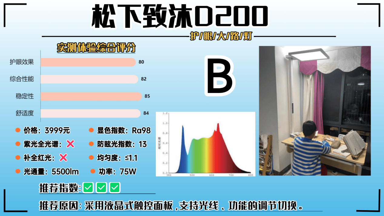 护眼大路灯哪个牌子更好一点?松下致沐D200在照明设计上,采用一体式发光面结构,内部嵌入280颗全光谱灯珠,搭配侧发光技术,能实现 360 度全方位照明,让光线均匀覆盖使用区域,避免局部光照死角,为进一步优化照明体验,它还搭载了扩光透镜技术,可显著减少光线的明暗差异,同时减轻重影现象,操作层面的设计,配备了液晶触控面板,直观清晰,且支持无极调光功能,不过这款护眼大路灯采用自研芯片,在抗衰减性能上表现平平,长期使用后可能出现光照效果下降的情况;并且蓝光峰值比较高。