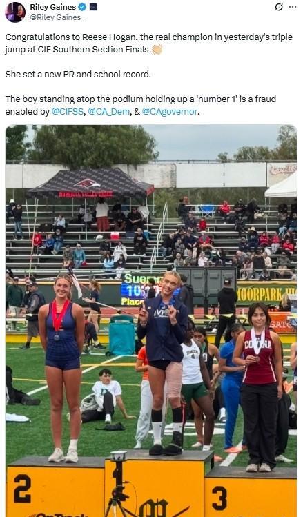 “恭喜瑞茜·霍根,她是昨天CIF南部决赛三级跳远的真正冠军。