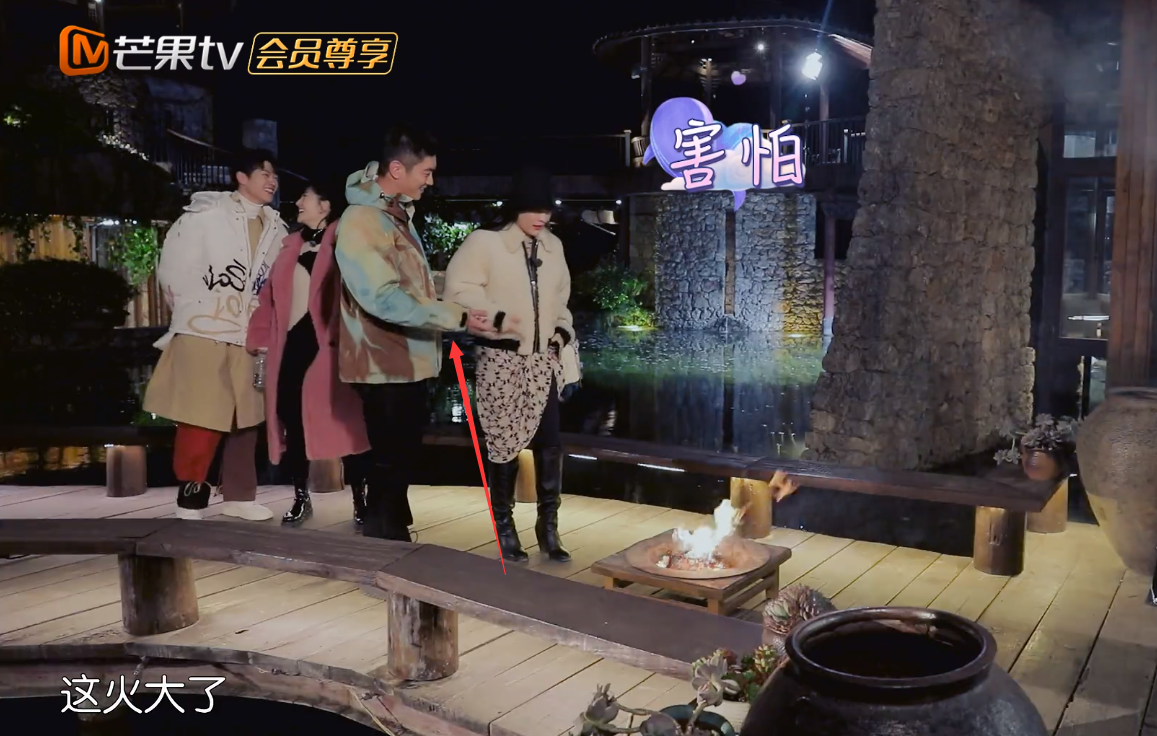 跨火盆时,霍思燕随口说了一句“火变大了”,杜江担心她害怕,立马就伸出了手护着霍思燕跨过去。