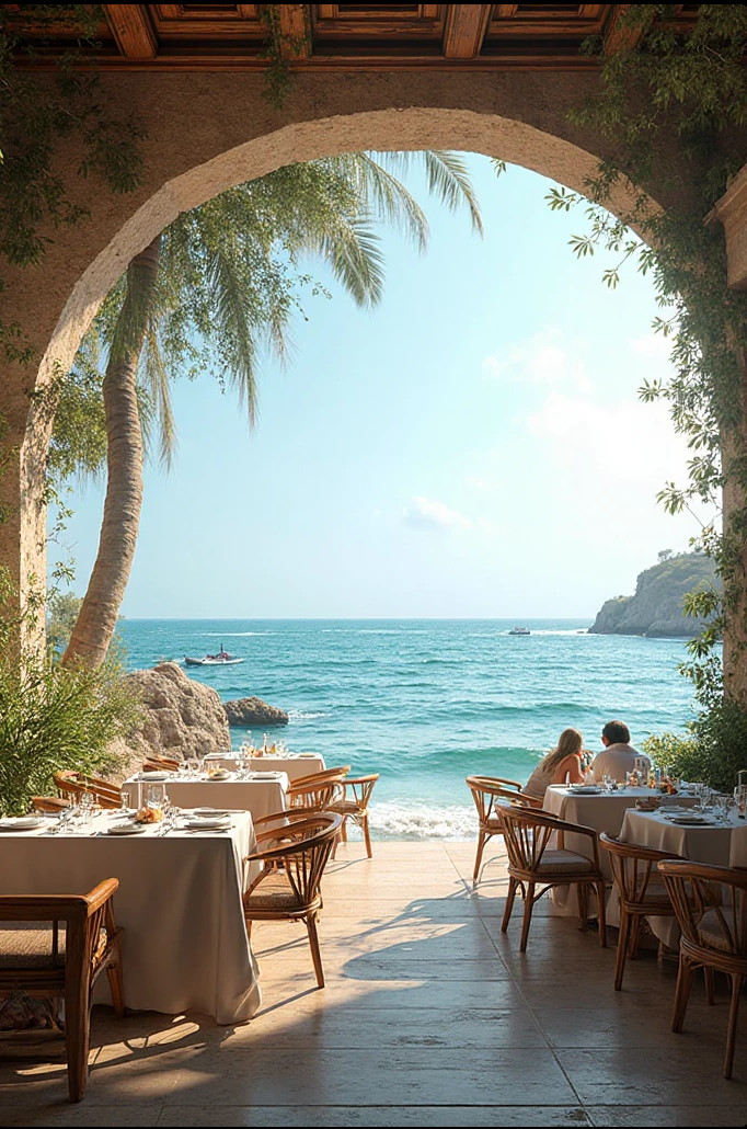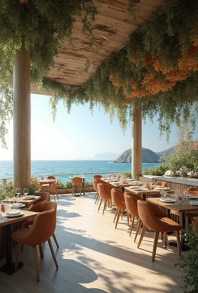 海边餐厅的第一印象,来自“开阔”。桌椅之间不要摆得太拥挤,尽量让每一个座位都能看到海景。木质、亚麻、藤编这些天然材质,比冰冷的金属更能和海边气质相融。
