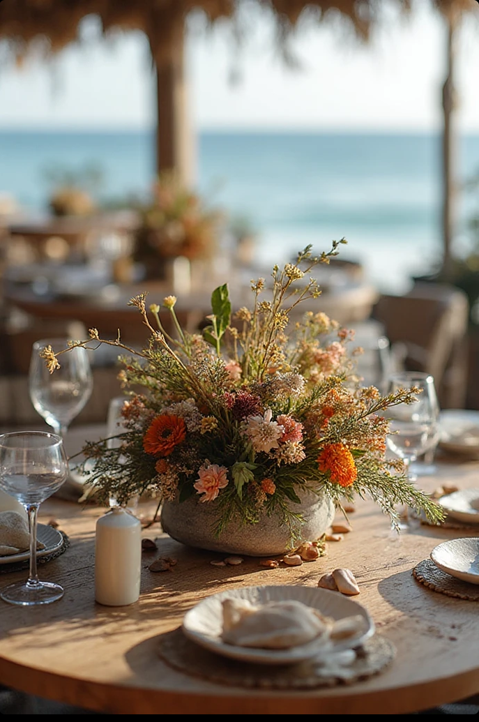 桌上的花艺不必精致到一丝不苟,随意、自然的摆放反而更符合海边氛围。花敢当在做餐桌布置时,常会用本地的绿植、干花,既耐风耐晒,也更贴近自然。再搭配一些小贝壳、石头,就能让餐桌有独特的记忆。