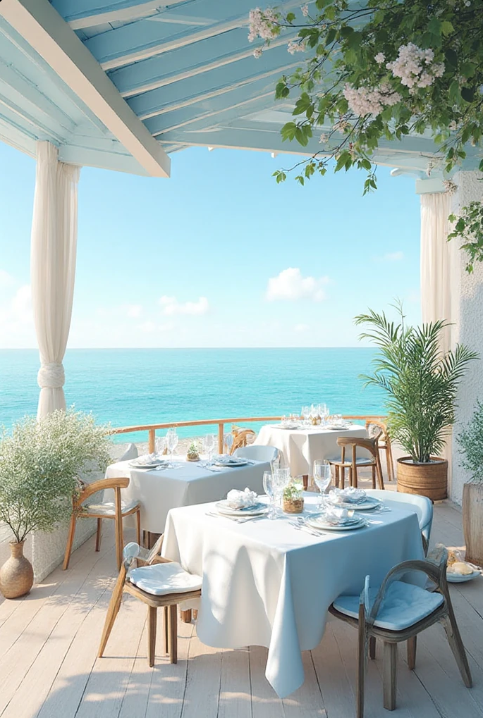 蓝色、白色和木色是海边餐厅的基本色调。配色不要太复杂,低饱和度的蓝与沙白搭配,就能带来干净、舒展的感觉。如果想有亮点,可以用绿色植物或一束花作为点缀。