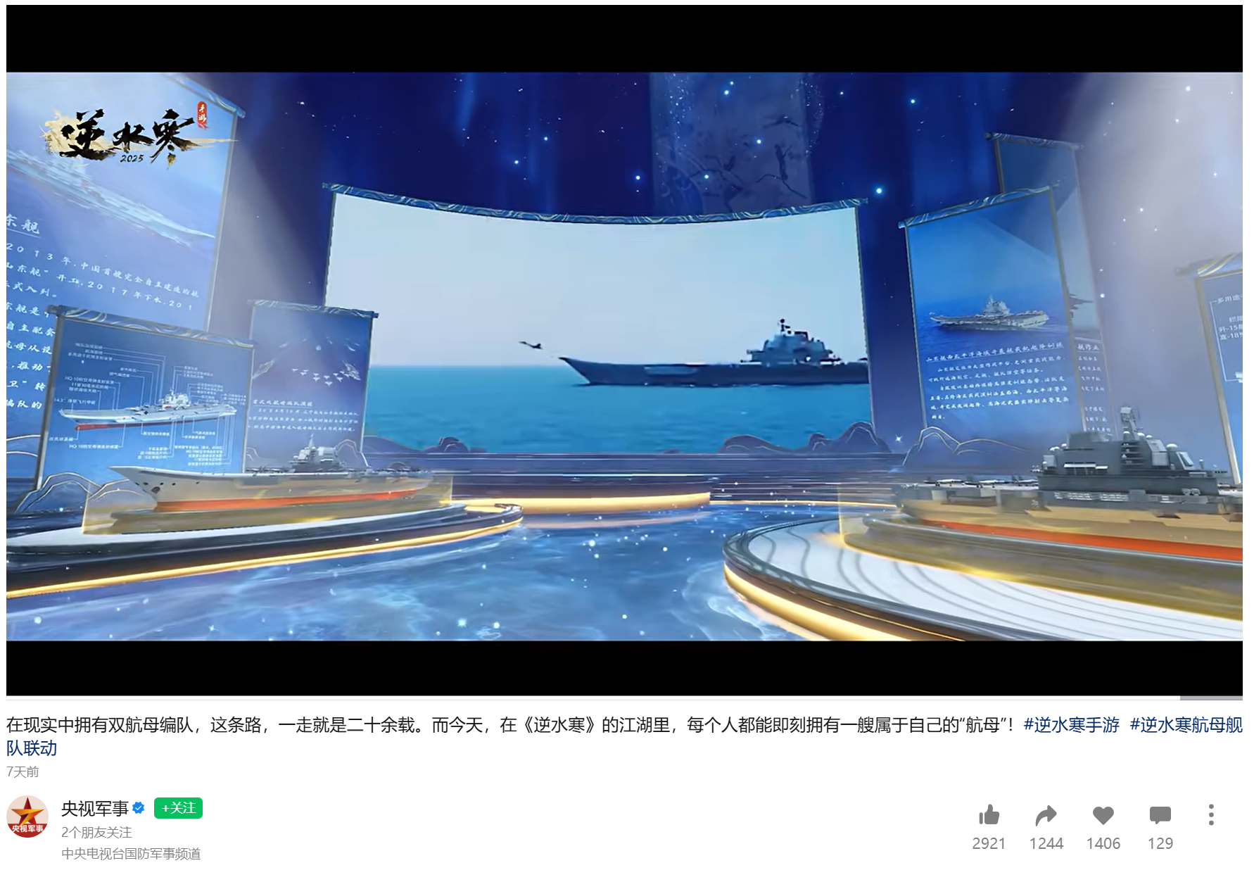 这种将游戏与国防科普结合的“线上博物馆”模式,既让玩家感受到航母魅力与科研人员的付出,又有效提升了公众的国防意识,因而获得国家级媒体认可。中央电视台国防军事频道专门发布游戏内航母任务的动画片段,高度评价此次公益联动:“现实中,中国拥有双航母编队历经二十余载;如今,在《逆水寒》手游中,每个人都能即刻拥有属于自己的‘航母’。”