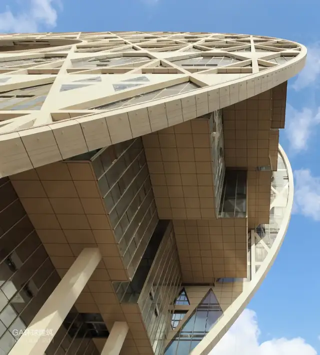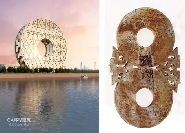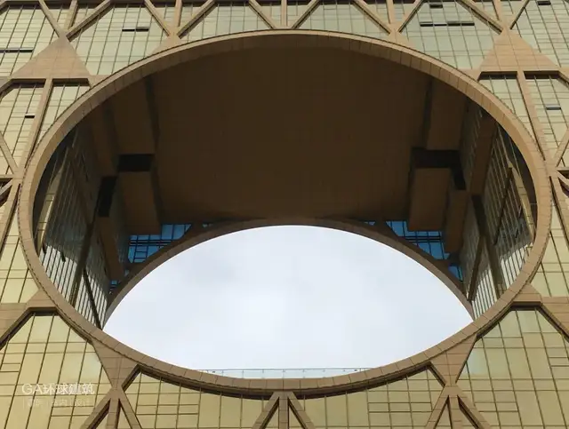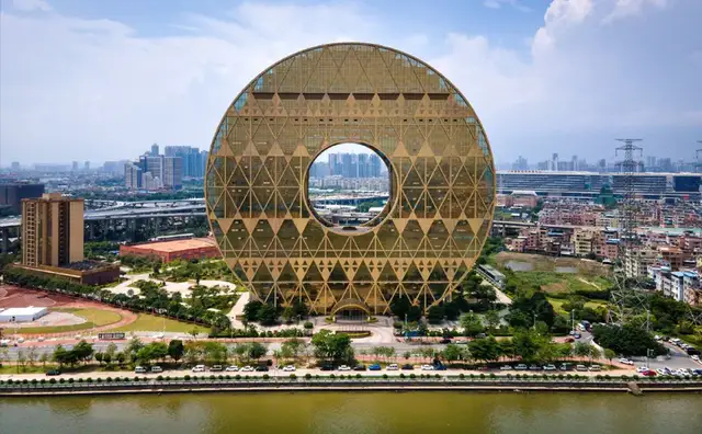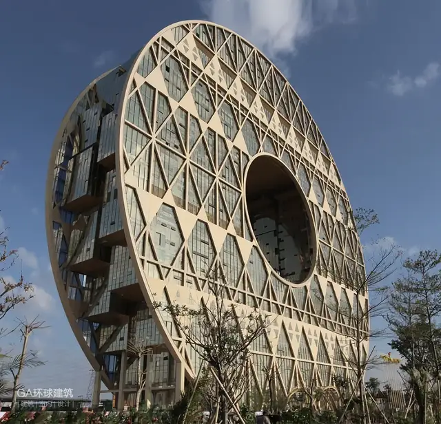 建筑以“天圆地方”为设计理念,将现代建筑美学与东方哲学、风水的命理学深度结合。造型灵感源自南越王墓古玉璧,立面4万平方米金色Low-E中空玻璃拼出30余种异形板块;圆环与珠江倒影构成“∞”符号,寓意“八方来财、交易长旺”。