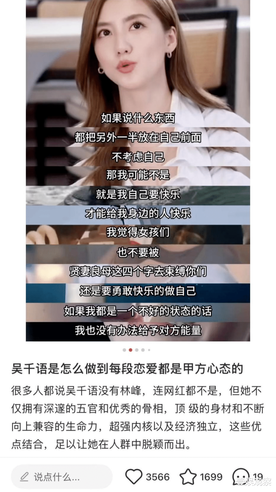 有网友认为,吴千语在每段恋爱中都做到了甲方心态,并分析起她的高配得感、精神内核等,俨然一副将其视为情感导师的模样。
