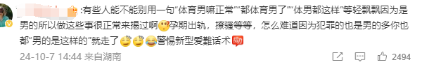 有人公然地在评论区说:“体育男正常啊,他们都这样”真没想到现在对男生这么宽容,练体育的出轨就合法化吗?难道体育男就可以单独有自己的行为规范,比如体育男=动物,可以突破人类道德体系,遵循原始本能就行