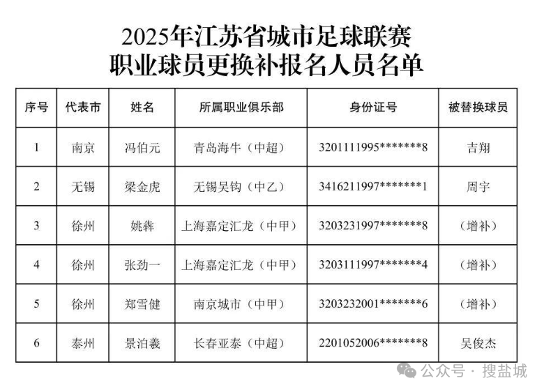 随着2025年国庆前夕的一纸公告,江苏省城市足球联赛(简称“苏超”)再度掀起波澜。9月29日,联赛官方正式公示职业球员更换补报名单,徐州队大手笔增补三人,南京、无锡、泰州三队各完成一次关键替换,犹如四枚战术棋子落下,瞬间点燃了联赛后半程的战火。这不仅是一次人员更迭,更是一场战略博弈的开端。