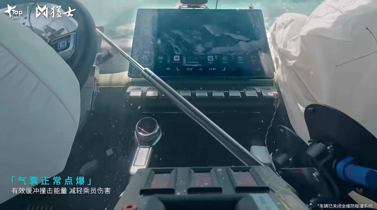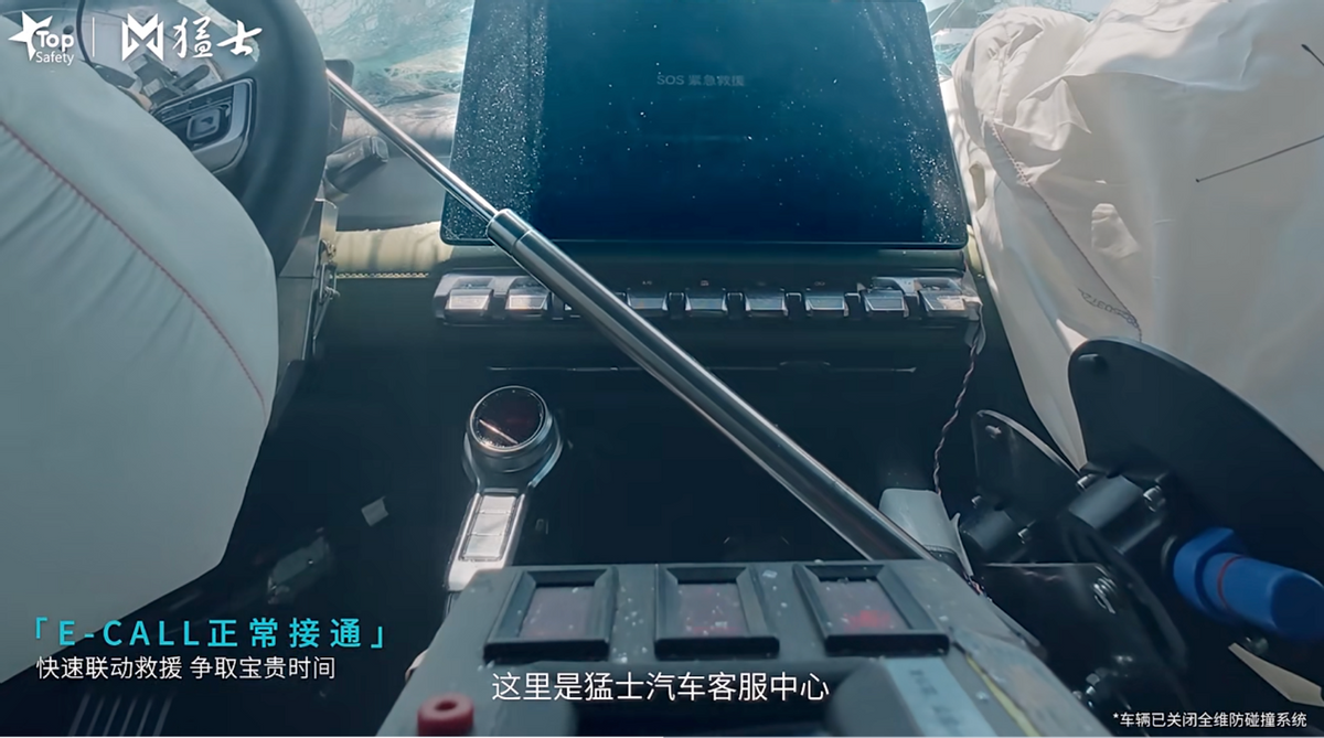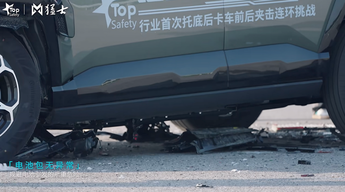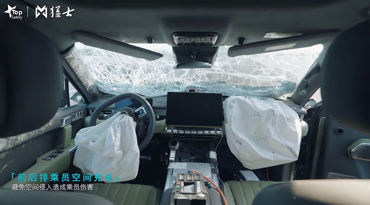 该测试标准远超C - NCAP常规测试工况,对新能源越野车的底部防护和刚性提出了极高要求。而猛士M817凭借高强度的笼式安全设计,在极限车祸场景中保证了结构安全,乘员舱结构完整,A、B、C柱未发生结构性失效,为乘员提供了可靠的生存空间。