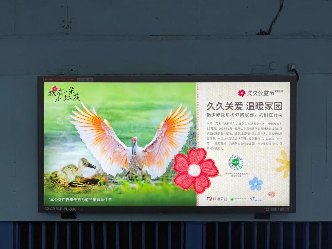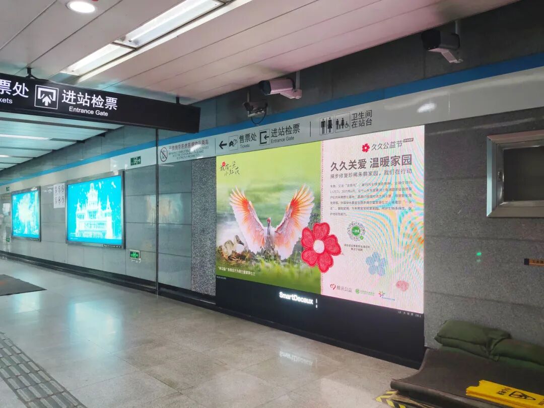为扩大“一块走”公益活动影响力,推动生态保护理念触达更多群体,9月5日至9月14日,中国绿化基金会“湿地守护计划”项目在北京、上海等城市地铁枢纽上线多个公益广告点位进行宣传,以朱鹮翩跹之姿展现湿地生机,呼吁公众关注濒危物种保护。画面中朱鹮成鸟舒展羽翼、幼鸟在巢的鲜活场景十分吸睛,期待公众能直观感受到朱鹮的灵动与珍贵,并呼吁大家参与“一块走”活动,通过捐步为修复朱鹮家园、守护湿地生态助力。
