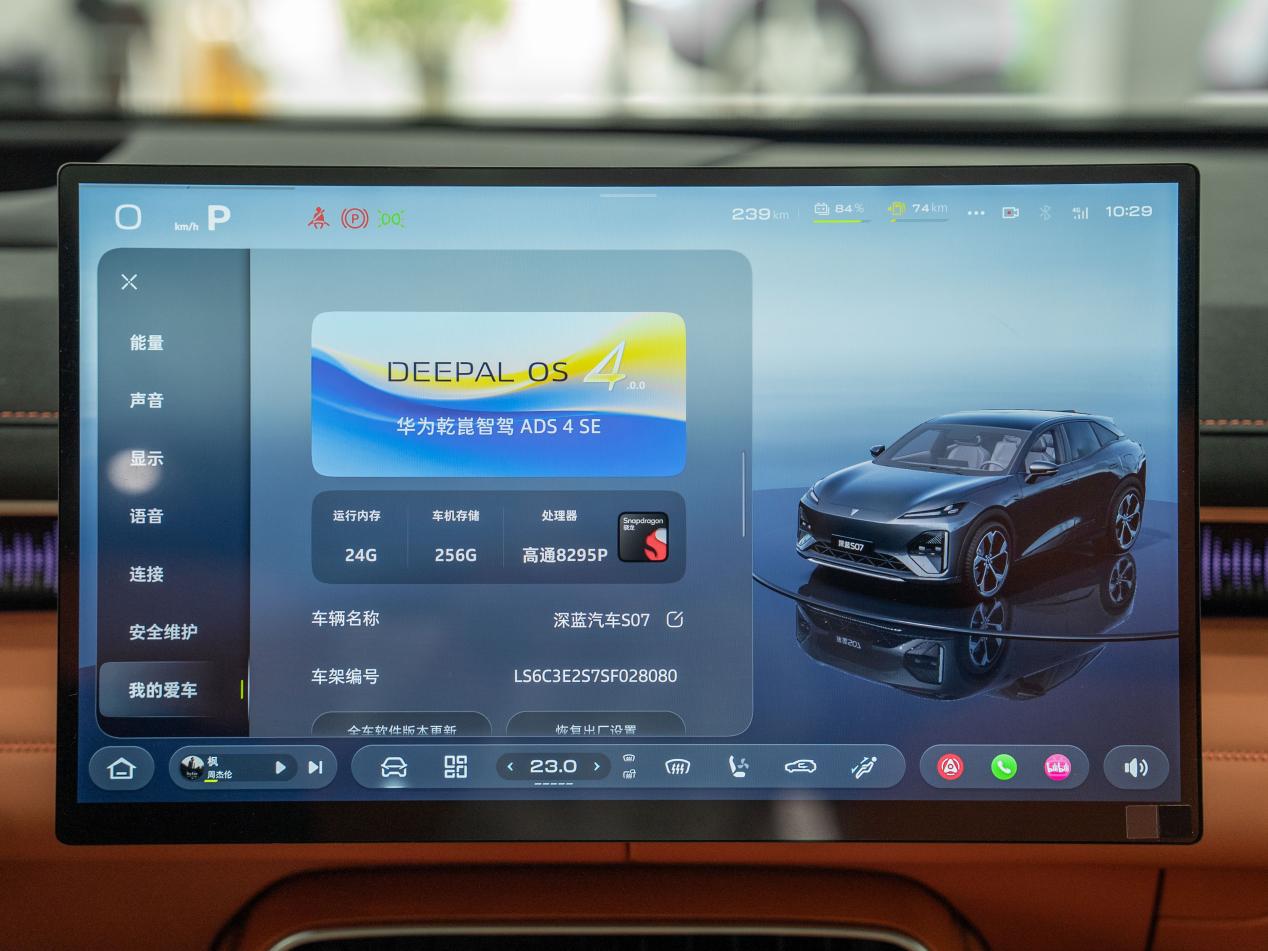 深蓝S07 EV还搭载了Deepal OS 4.0智能操作系统,采用目前同级领先的高通骁龙8295P芯片,其运算速度较主流8155芯片有显著提升,因而显示清晰度和系统流畅度都表现出色,可满足同时开启导航、音乐播放、AI语音交互时的多任务处理能力,整体交互体验流畅丝滑“零延迟”。