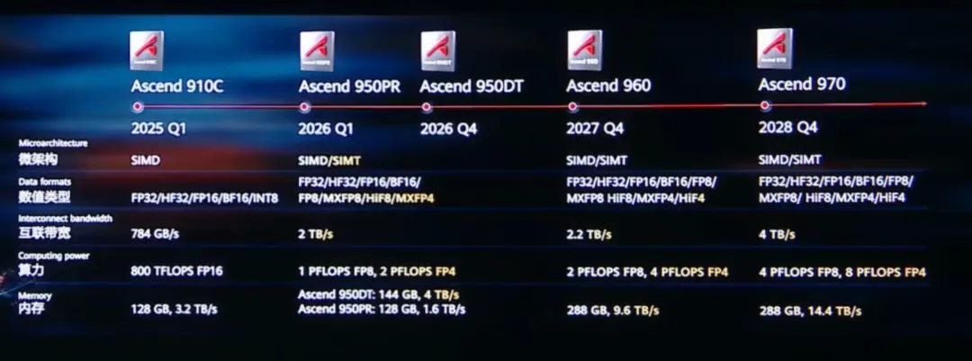他表示,未来三年,华为已经规划了昇腾多款芯片,包括950PR,950DT以及昇腾960和970。其中950PR2026年第一季度对外推出,该芯片采取了华为自研HBM。