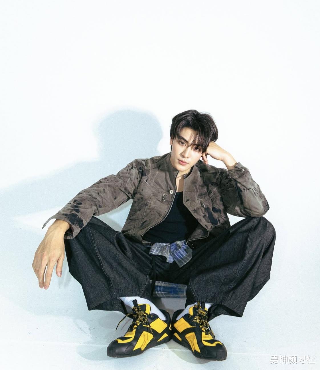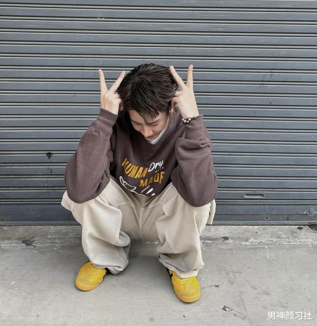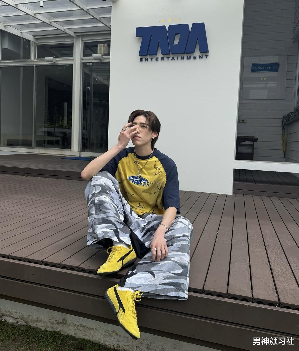 黄色运动鞋也很适合拿来玩撞色,比如pp就拿着它来搭配黄色的上衣,特别吸睛。当然,他很聪明的地方还在于,他还用了一条迷彩裤,瞬间就让穿搭变得有意思了。