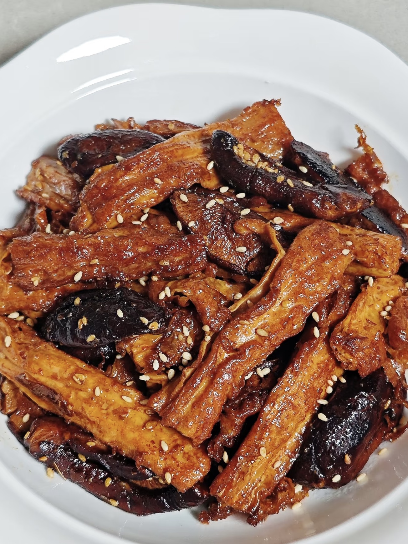 料汁倾盆而入,“滋啦”一声,酱汁遇到热锅瞬间冒泡,像小型火山喷发。快速翻动,让每片腐竹都裹上“孜然外套”,盖盖子小火焖一两分钟,让汤汁缩进纤维里。关火前再撒一把生孜然粒+芝麻,高温一激,孜然味二次爆炸,香味顺着窗缝飘到楼上,遛狗的大叔会站在门口不走。
