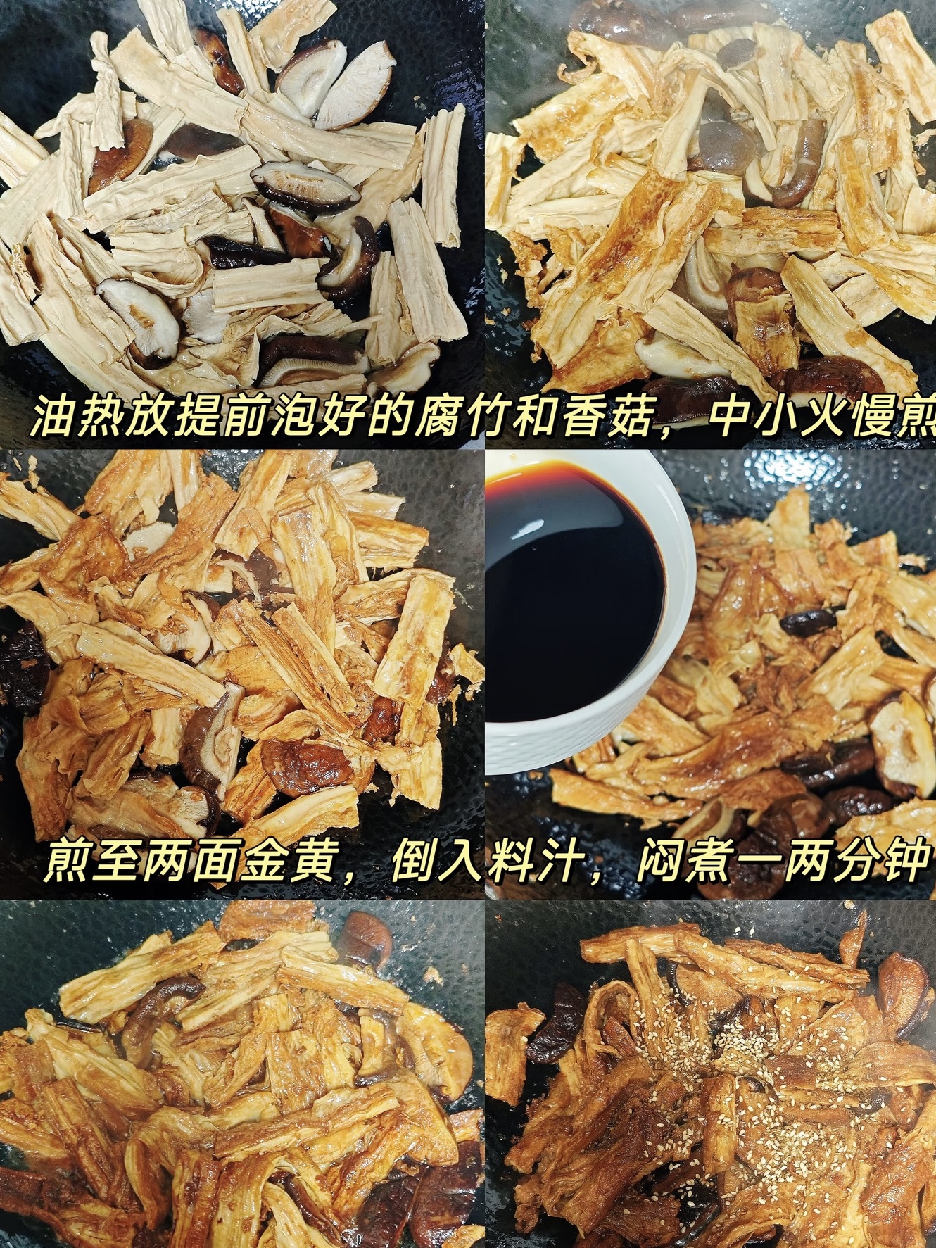 开锅热油,油别省,腐竹吸油才香。筷子扎进油锅,边缘冒小泡就下腐竹,中小火慢煎,像给腐竹做“日光浴”。两面煎到微金黄,边缘起泡,像豆皮在跳“泡泡舞”,立刻倒入香菇片,继续翻炒三十秒,让香菇“毛孔”打开,提前吸味。整个过程厨房会飘起“豆制品+油脂”的致命香气,室友会突然出现在门口问“是不是点烧烤”。
