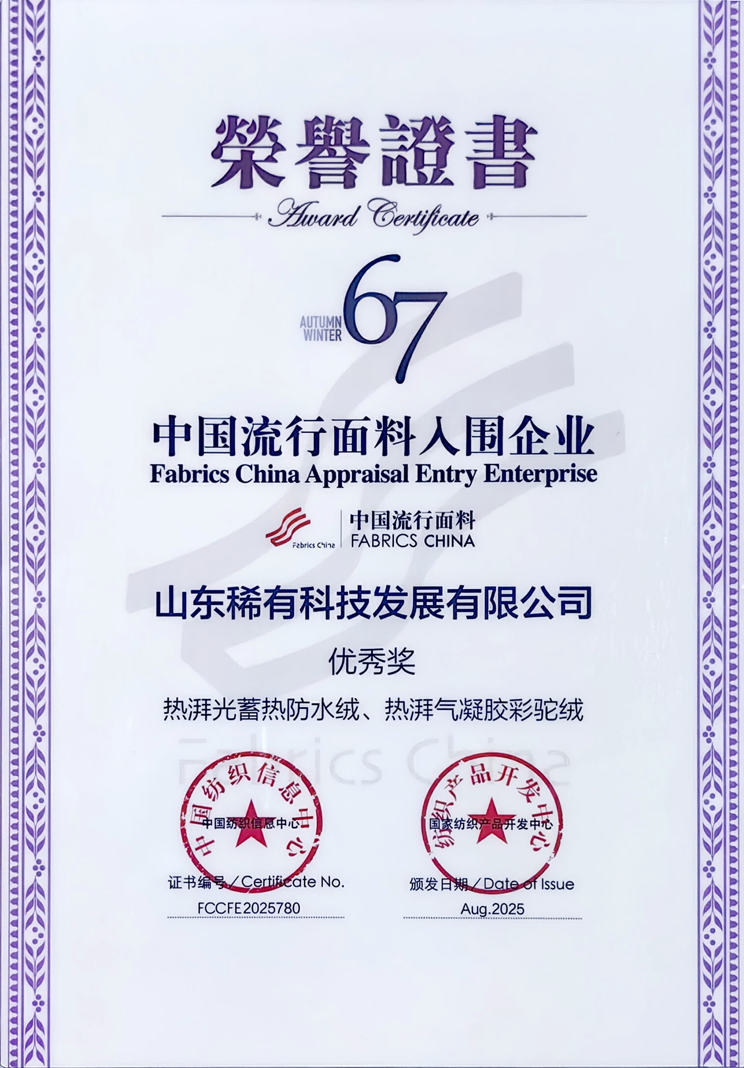2025中国国际面料设计大赛暨第54届(2026/27秋冬)中国流行面料入围评审,来自540家企业的4540款面料作品参与评审,参评作品覆盖男正装、时尚女装、休闲装、运动装、牛仔、衬衫等消费领域,从花型设计、色彩运用、技艺创新及品质塑造等多方面展现了中国流行面料的引领性和前瞻性,中国纺织产业的创新脉搏在此强劲跳动,山东稀有科技发展有限公司(稀有高科)参评的“热湃光蓄热防水绒”和“热湃气凝胶彩驼绒”2款作品脱颖而出,双双荣获优秀奖。