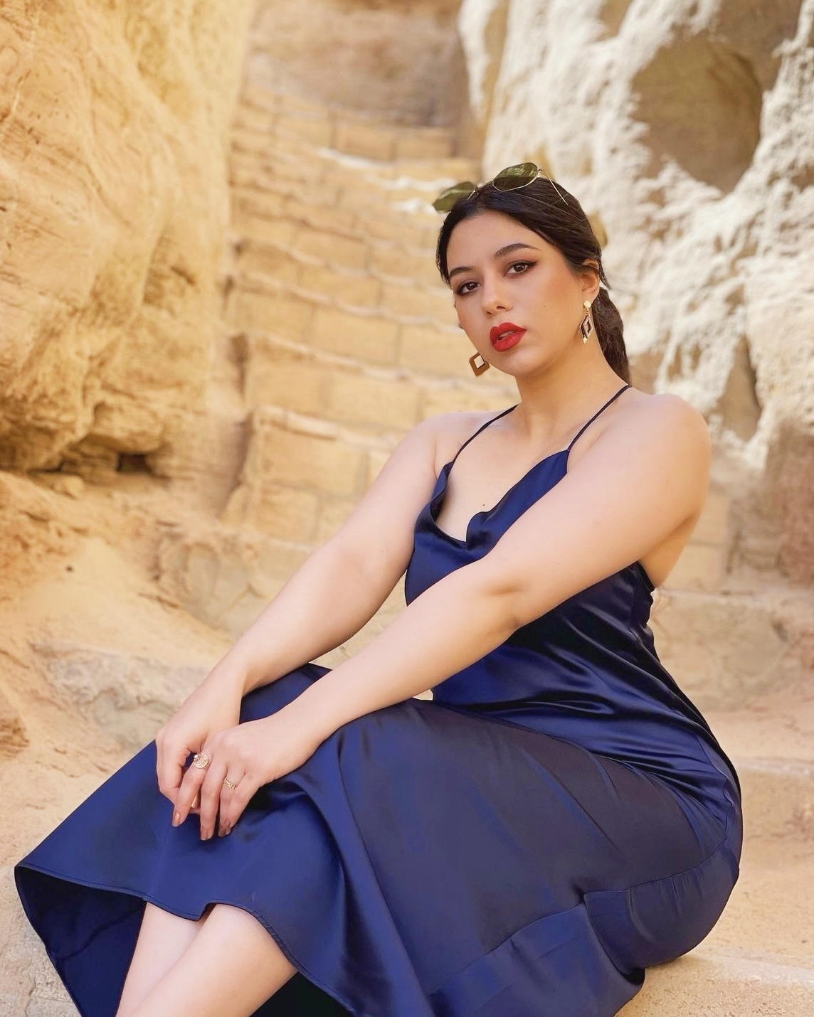 在一片晴朗的沙漠地带,一位美女以她的穿搭吸引了所有目光。她身着一件深蓝色的吊带长款连衣裙,款式简洁大方,颜色深邃典雅,完美地展现了她的优雅气质。