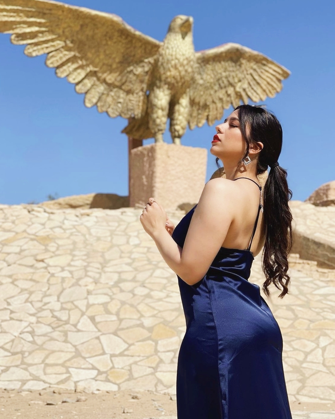 背景中的沙漠地带和巨大人脸雕塑,为这位美女的造型增添了一层神秘和庄严的氛围。历史人物雕像的存在,仿佛在诉说着古老的故事,与现代的时尚元素形成了鲜明对比,展现了一种跨越时空的美感。