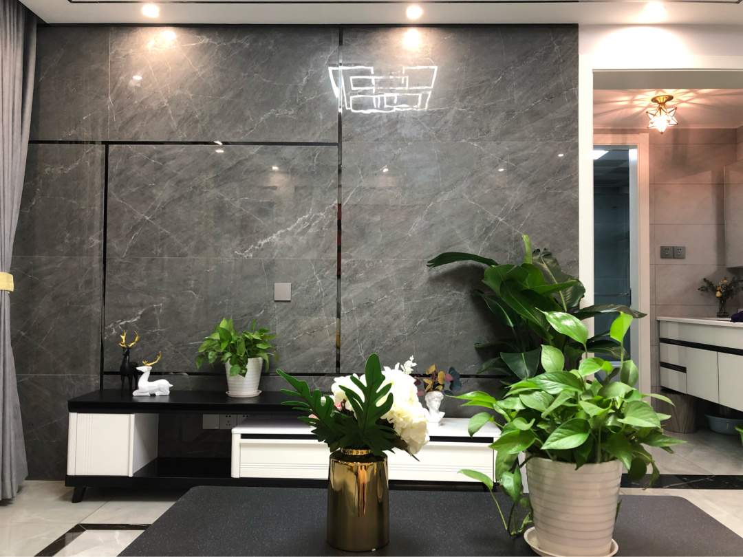 电视背景墙直接灰色的瓷砖上墙做的简单装饰,再用银黑色的装饰条做了简单的分割,使得整个背景墙看起来不会那么单调,现在就差电视机了。