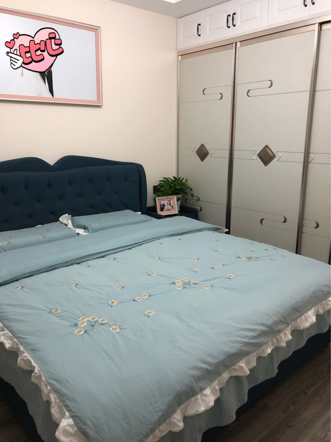 卧室,定制的衣柜实用性超强,收纳空间超大,推拉门作为隔断门,不会占用到空间,实木的地板更为的温馨。