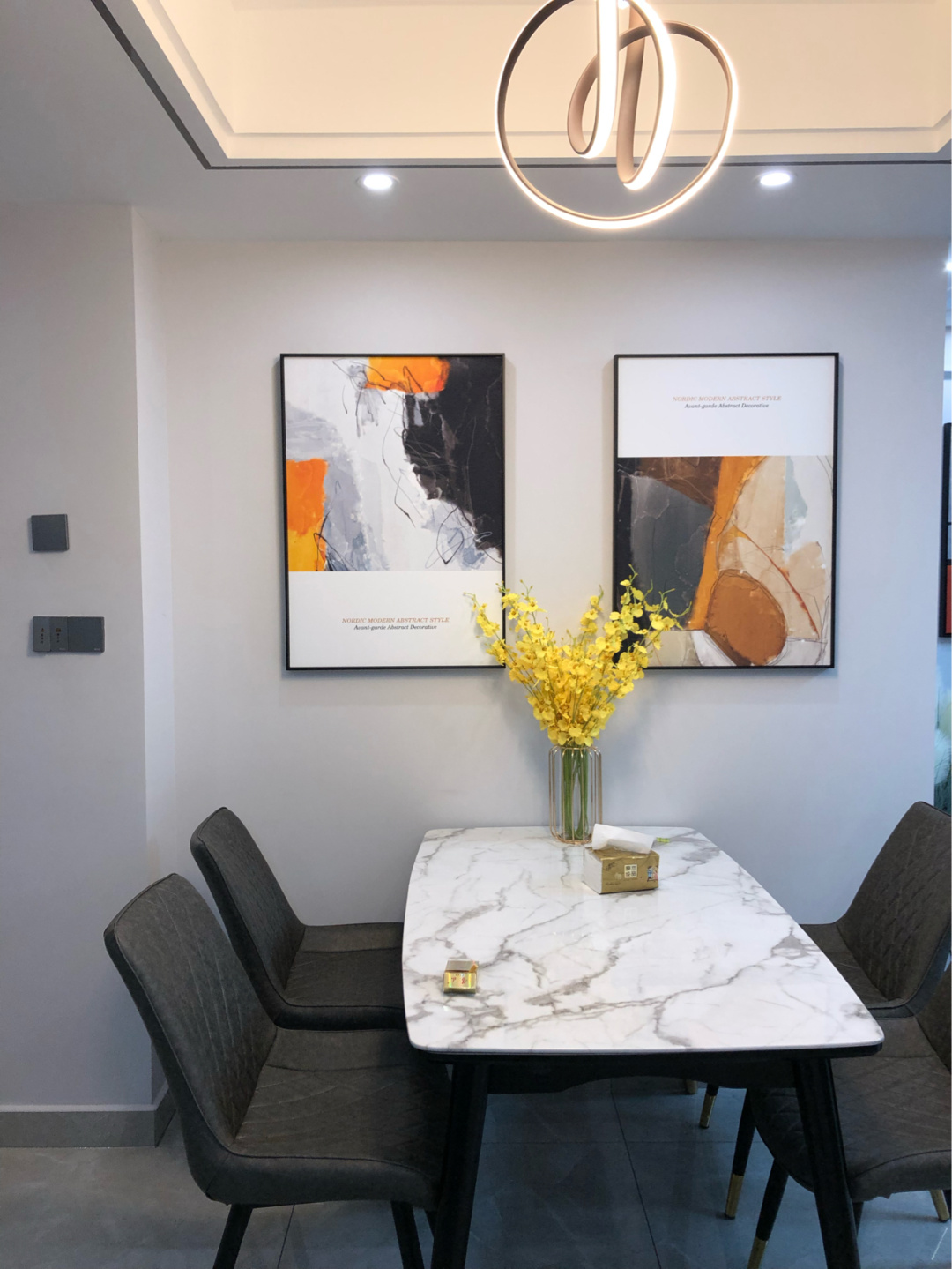 在入门后的右手边就是餐厅的空间了,充分利用了玄关到客厅之间的空间,把这个空间利用起来作为餐厅是非常实用的,因为餐桌椅靠着墙面摆放不会占用到过道的空间,利用墙面挂上装饰画更加的好看和时尚。