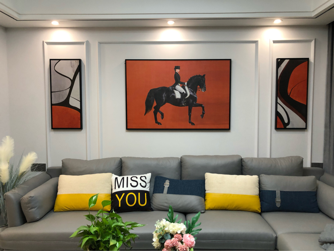 客厅,沙发背景墙做了简单的造型装饰,石膏材料做的造型整体感很强,再加上装饰画的装饰,灰色的沙发搭配起来,整个沙发区时尚感很强,实用性也很好,毕竟沙发的空间那么大,而且色彩上的搭配也十分的舒适。