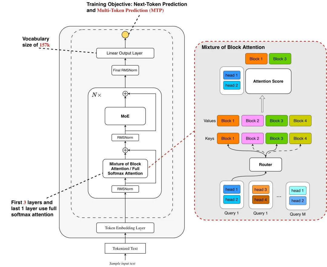 Ling 2.0 Sparse 是专为应对大语言模型未来两大核心趋势 —— 上下文长度扩展(Context Length Scaling) 与测试时扩展(Test Time Scaling)而设计的高效稀疏注意力机制。我们借鉴了Mixture of Block Attention (MoBA),采用块级稀疏注意力(block-wise sparse attention),将输入的 Key 和 Value 按块(block)划分,每个 query 在 head 维度上进行 top-k 块选择,仅对选中的块执行 softmax 注意力计算,从而显著降低计算开销。同时,我们将 MoBA 设计和 Grouped Query Attention (GQA) 结合,使同一组内的 query heads 共享 top-k 块选择结果,让一次块读取可服务于多个 query head 的注意力计算,进一步减少 I/O 开销。
