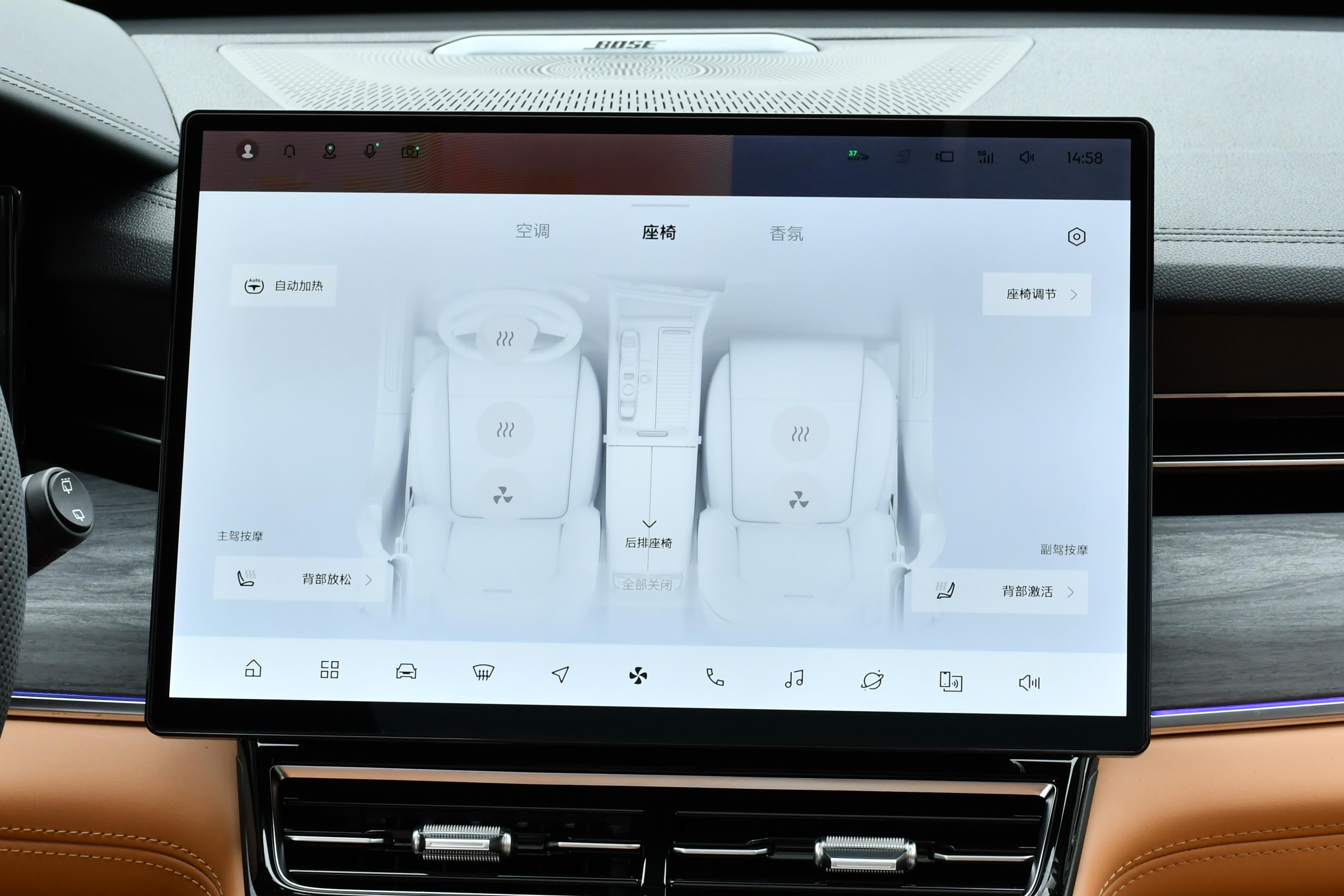 二排座椅靠背能调角度,怎么舒服怎么来。便捷配置也很到位,二排有小桌板,办公、吃零食、放绘本都方便;中央扶手功能多,双杯架、手机存放区、储物暗格、USB充电口一应俱全,随手要用的东西都有地方放。感官体验也花了心思,14个扬声器的Bose音响效果沉浸,听歌看电影都享受;双层隔音玻璃降低6分贝风噪,车里特别安静;海洋之谜香氛系统让车内空气清新;四温区空调让每个人都能调到喜欢的温度。更惊喜的是空间灵活性,调节座椅能变成“双人沙发床”或“2米大床”,长途旅行后排能躺平休息。我觉得领克09抓住了家庭用户需求,舒适性和实用性都到位,让燃油车也有电车的豪华体验。