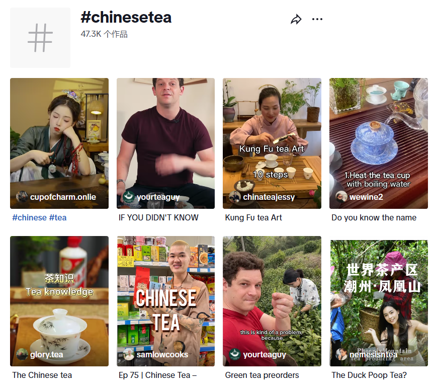 要知道,TikTok用户对中国茶叶有极高的兴趣。在TikTok上搜索#Chinesetea标签,可以看到4.73万条相关作品,曝光量超过4亿次。