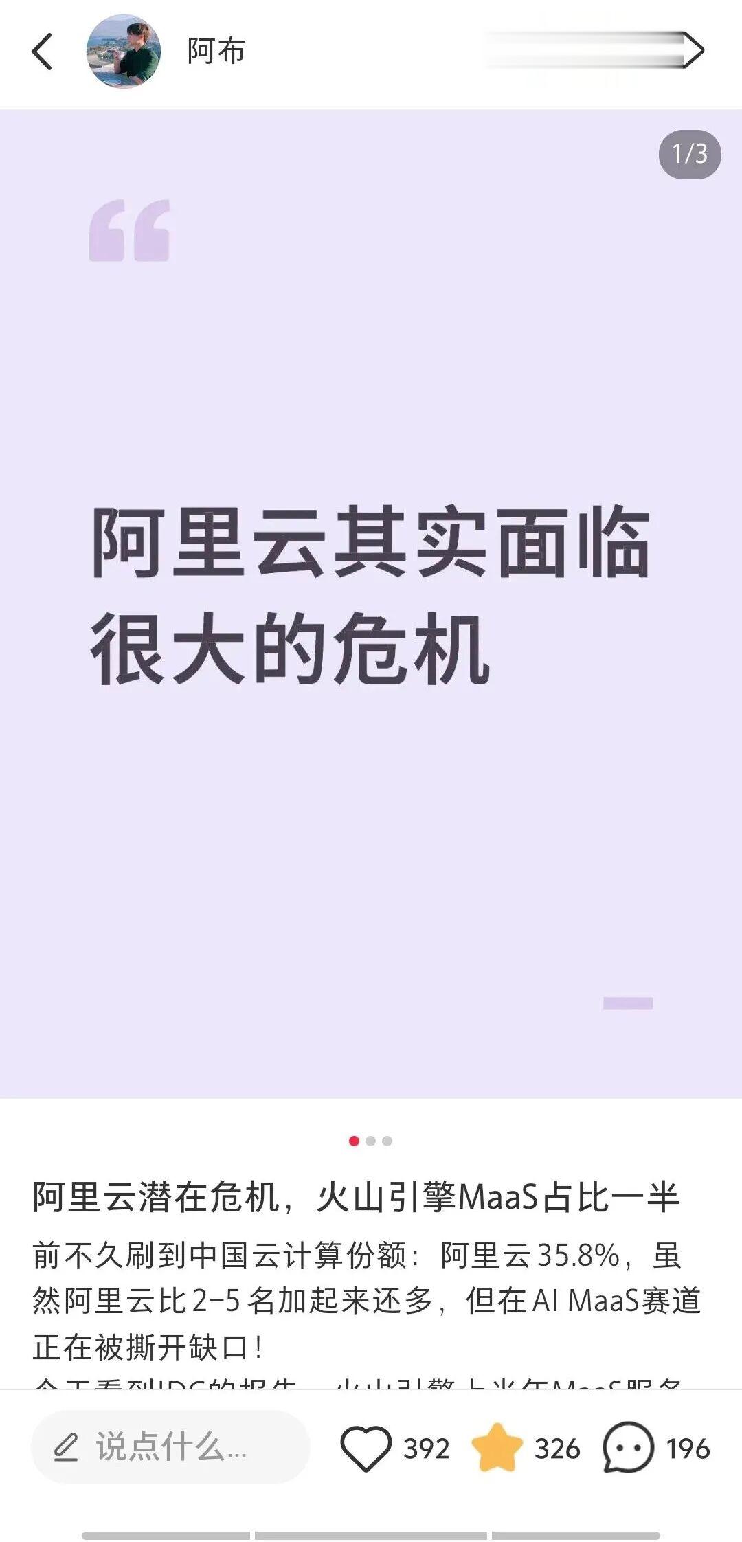 在阿里工作11年、前阿里云员工、现AI创业者“阿布”,近日就在社交平台公开表示,MaaS赛道被火山引擎远远拉下,阿里云潜在危机主要在以下三方面。
