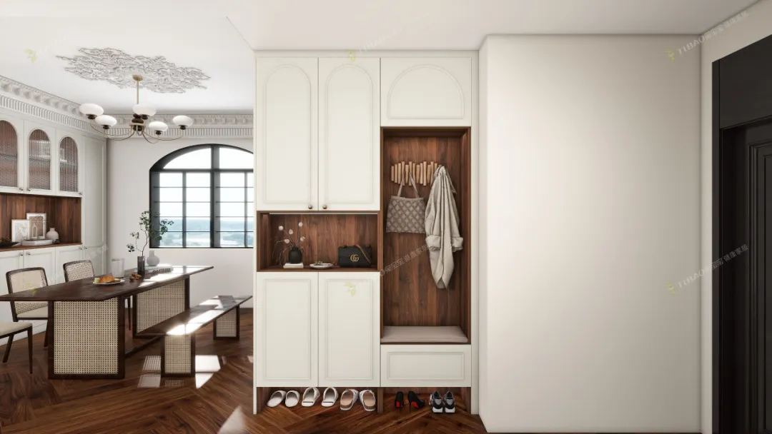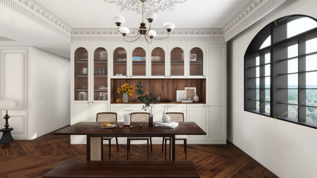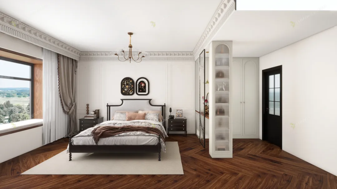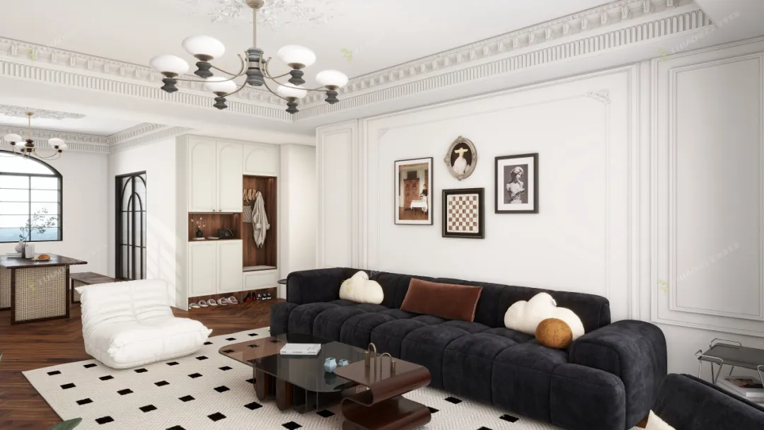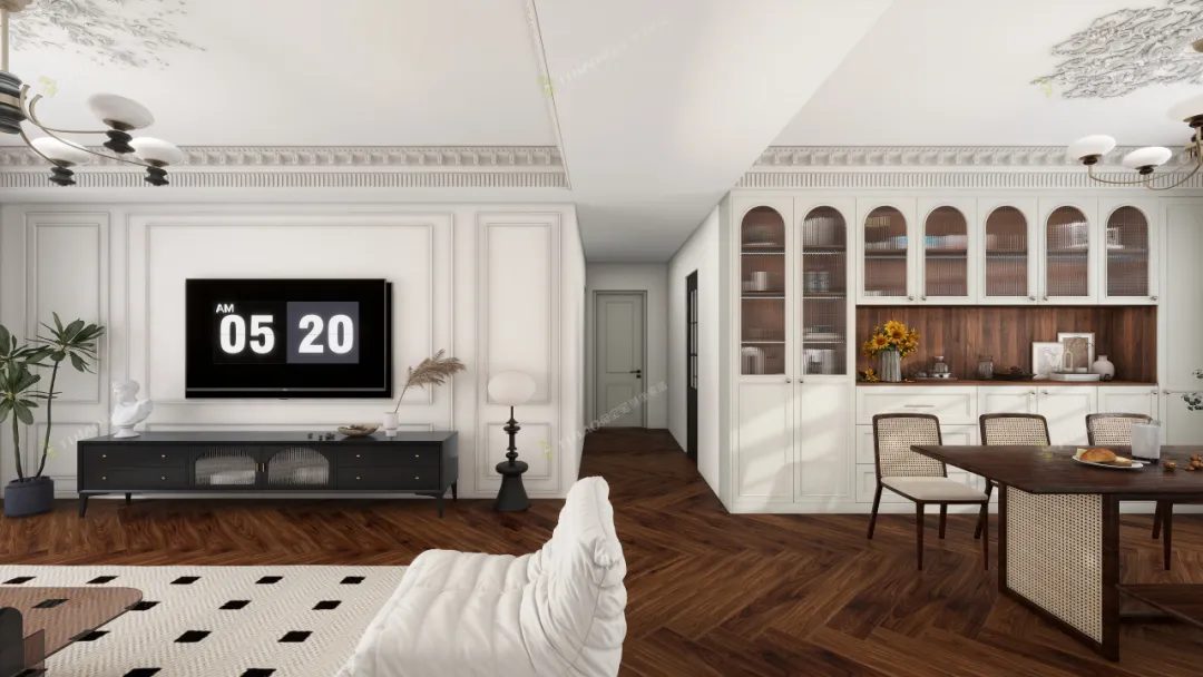 融入法式灯盘,复古老钢窗,PU线条,精致角花,复古挂画,搭配胡桃木与少量的藤编元素,拿捏电影里的高级感复古氛围,顶部采用虎头线与钢琴键石膏线,更能凸显法式复古氛围。