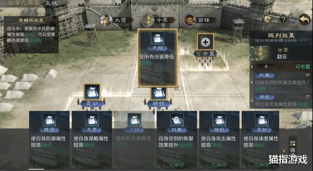 新上线的阵法系统让部队可以配置不同阵型,每个阵法有大营、中军、前锋专属的阵列效果,属性增强、战法距离提升,全靠你排兵布阵。