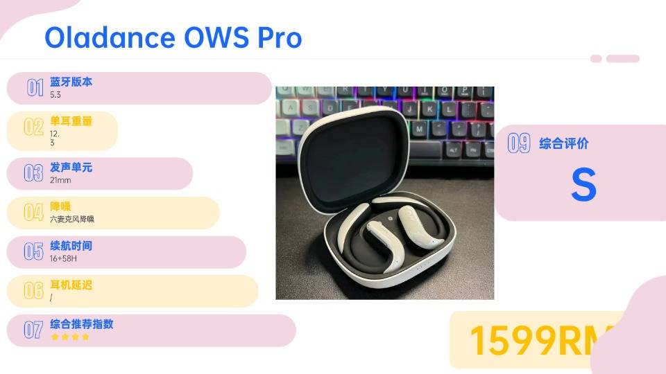 核心配置方面,这款耳机搭载高精度叠层扬声器单元,配备 “主芯片 + 功放芯片” 的双驱动架构,结合智能低音补偿与动态EQ算法,带来层次清晰、环绕感强的立体声体验;同时能有效削弱中低频杂音,让声音更显纯净自然。Oladance OWS PRO采用反向声波泄漏抑制技术,大幅减少漏音现象,提升私密听感;还内置专注模式、听力保护模式与防风噪通话模式,可针对不同场景进行智能切换。
