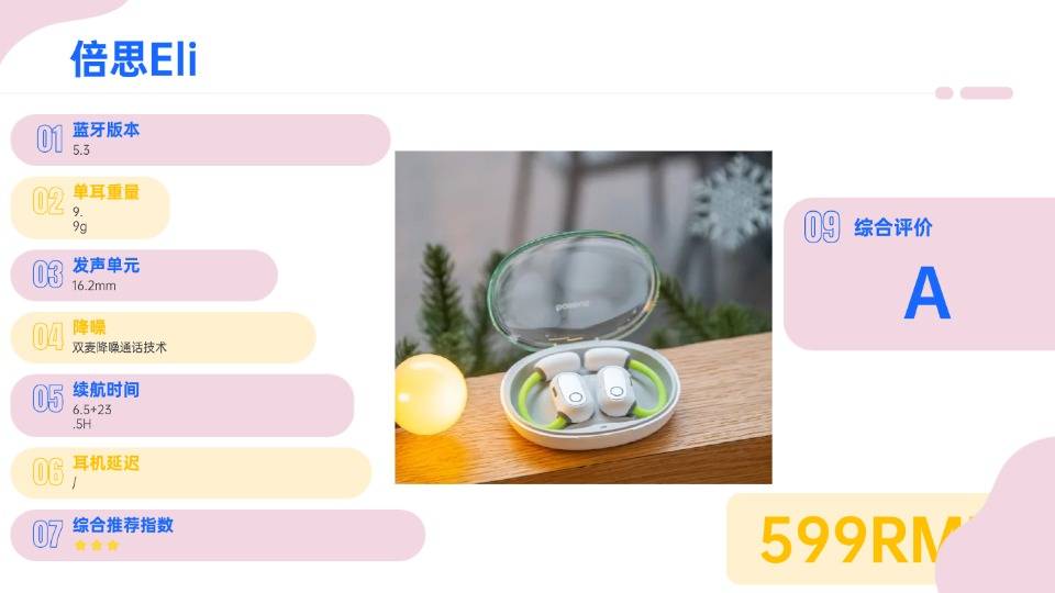 通话与连接性能上,这款耳机配备双麦克风阵列,结合ENC技术与AI智能降噪技术,大幅提升了语音通话清晰度;同时支持倍思DCLL双通道低延迟、BSC智慧双连以及BRC闪充等技术,让连接更稳定、响应更迅速、充电更高效。