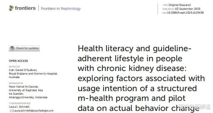 [1] Schmidt LI, Jokisch MR, Espey L,et al. Health literacy and guideline-adherent lifestyle in people with chronic kidney disease: exploring factors associated with usage intention of a structured m-health program and pilot data on actual behavior change[J]. Front Nephrol. 2025 Sep 3;5:1629438. Doi: 10.3389/fneph.2025.1629438.