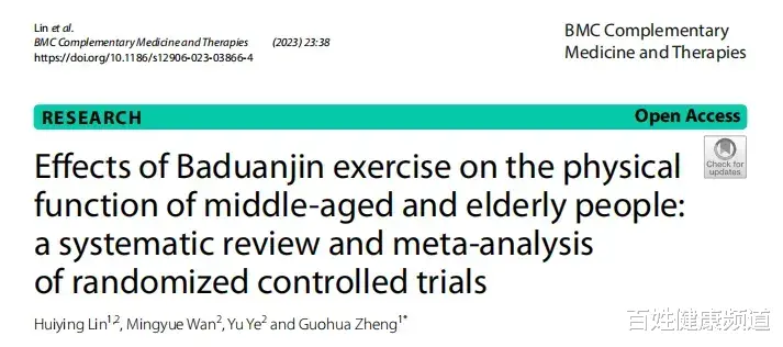[8] Lin H, Wan M, Ye Y,et al. Effects of Baduanjin exercise on the physical function of middle-aged and elderly people: a systematic review and meta-analysis of randomized controlled trials[J]. BMC Complement Med Ther. 2023 Feb 6;23(1):38. doi: 10.1186/s12906-023-03866-4.