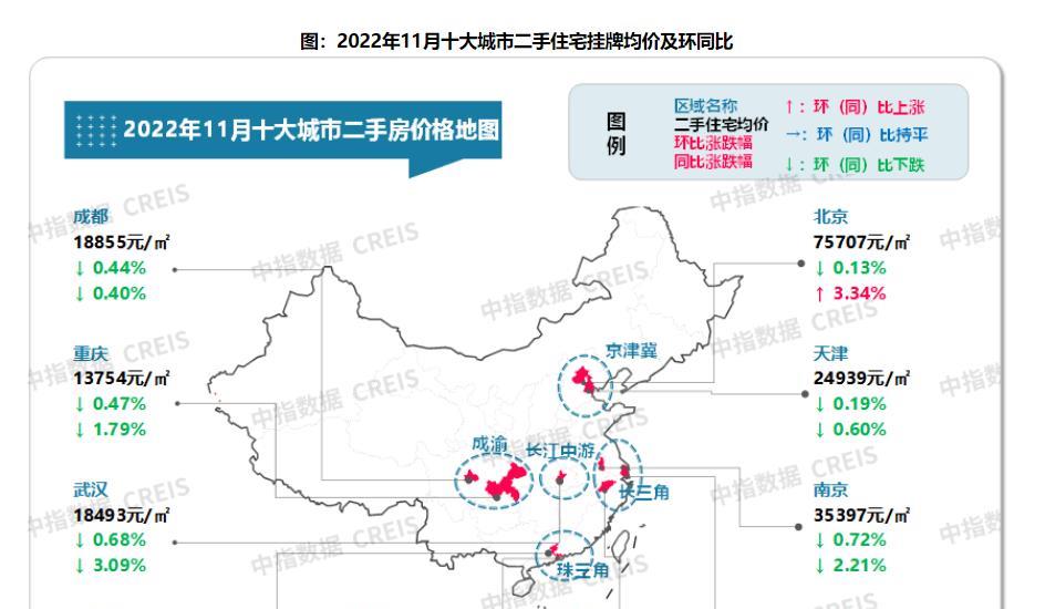 其次,二线城市的降温趋势依旧在持续,百城价格指数数据显示,2022年11月,百城二手住宅均价环比下跌0.21%,已连续7个月环比下跌,跌幅较10月扩大0.05个百分点。十大城市二手住宅均价环比由持平转为下跌,跌幅为0.25%;同比上涨0.72%,涨幅较10月收窄0.22个百分点,连续15个月出现收窄。环比来看,十大城市二手住宅价格环比一涨九跌,唯一上涨城市为上海,涨幅为0.20%,其中武汉、南京跌幅最为明显。