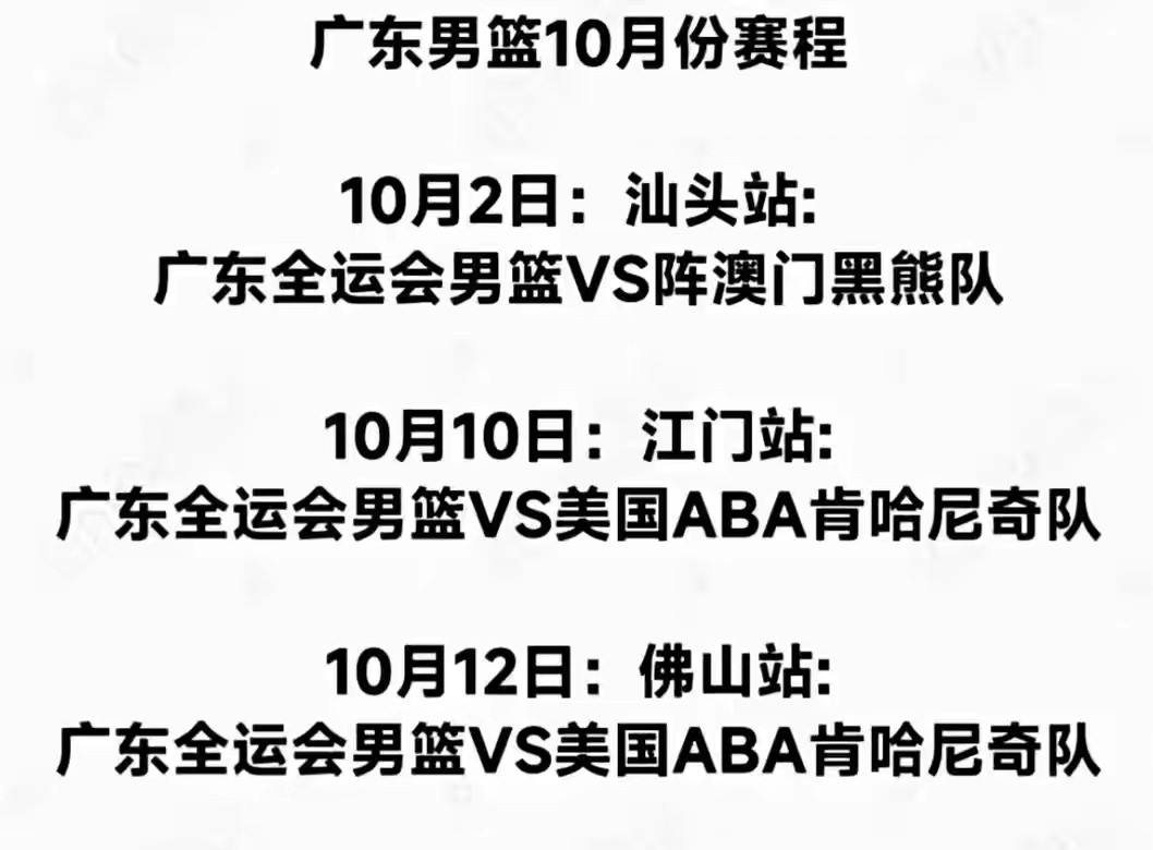 广东全运队10月上旬会有四场重要的热身赛,分别是10月2日在汕头迎战澳门黑熊队。10月10日和12日,在江门和佛山与美丽国ABA肯哈尼奇队连战两场。10月15日广东队将与世界篮坛劲旅俄罗斯莫斯科迪纳摩队交锋。