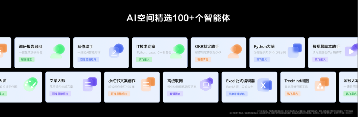 华为MateBook X Pro首发搭载华为AI空间功能,通过AI空间用户可以一键直达丰富的AI应用[22],更支持100+个智能体,是一站式AI能力聚合入口,能让代码编程、PPT制作、论文阅读排版、收集学习资料、视频图片创作、旅行规划等场景更高效,更便捷。