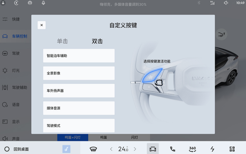 在细节方面,领克Z20的LYNK Flyme Auto 2.0.0版本更新同样不遗余力。液晶仪表显示新增了导航红绿灯倒计时、电池电量百分比等实用功能,HUD则新增了巡航红绿灯倒计时、绿波车速、目的地剩余里程与时间等显示,为驾驶者提供了更加全面、直观的行车信息。同时,系统还对车控车设进行了优化,如RPA泊车辅助的改进、方向盘自定义按键新增双击指令、氛围灯亮度调节以及地图导航音量记忆等功能的加入,都使得车辆控制更加贴合用户使用习惯,实现了真正意义上的个性化驾驶体验。这些细节的调整,不仅提升了驾驶的便捷性和安全性,也让用户感受到了领克品牌对品质的执着追求。