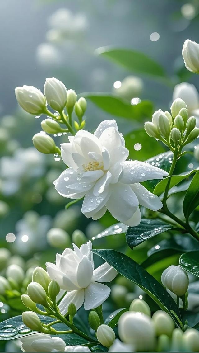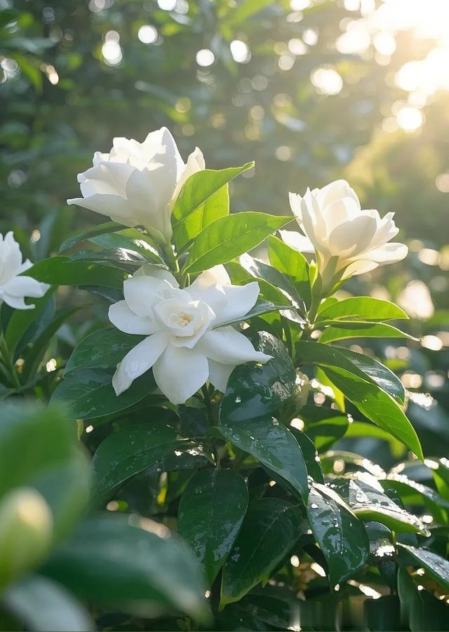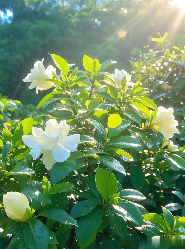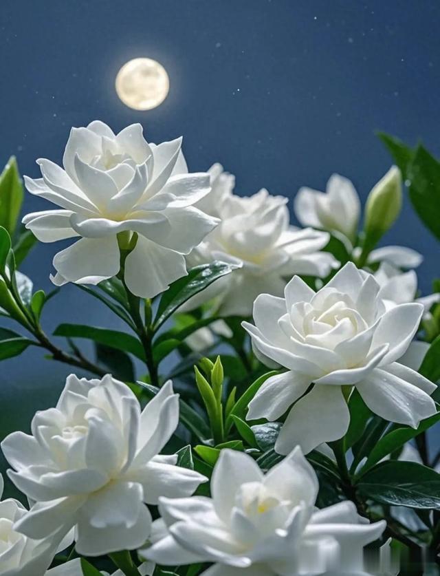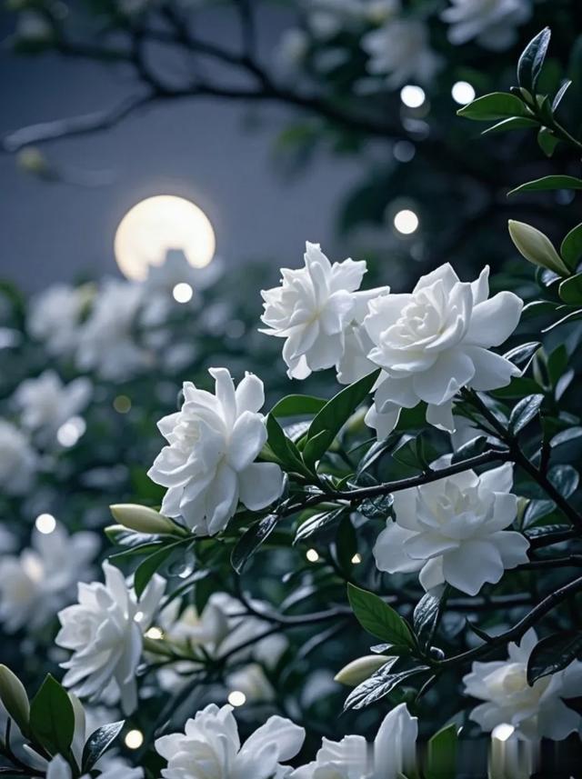 这不是单纯的花开,而是月光与留白共同谱就的散文诗。当银纱般的光华漫过花瓣的褶皱,当星芒在露珠里折射出碎钻的璀璨,每朵栀子都是夜空中永不熄灭的星盏,在大面积的留白里静静燃烧着清透的诗意,让人间的夜,忽然有了手可摘星辰的温柔错觉。
