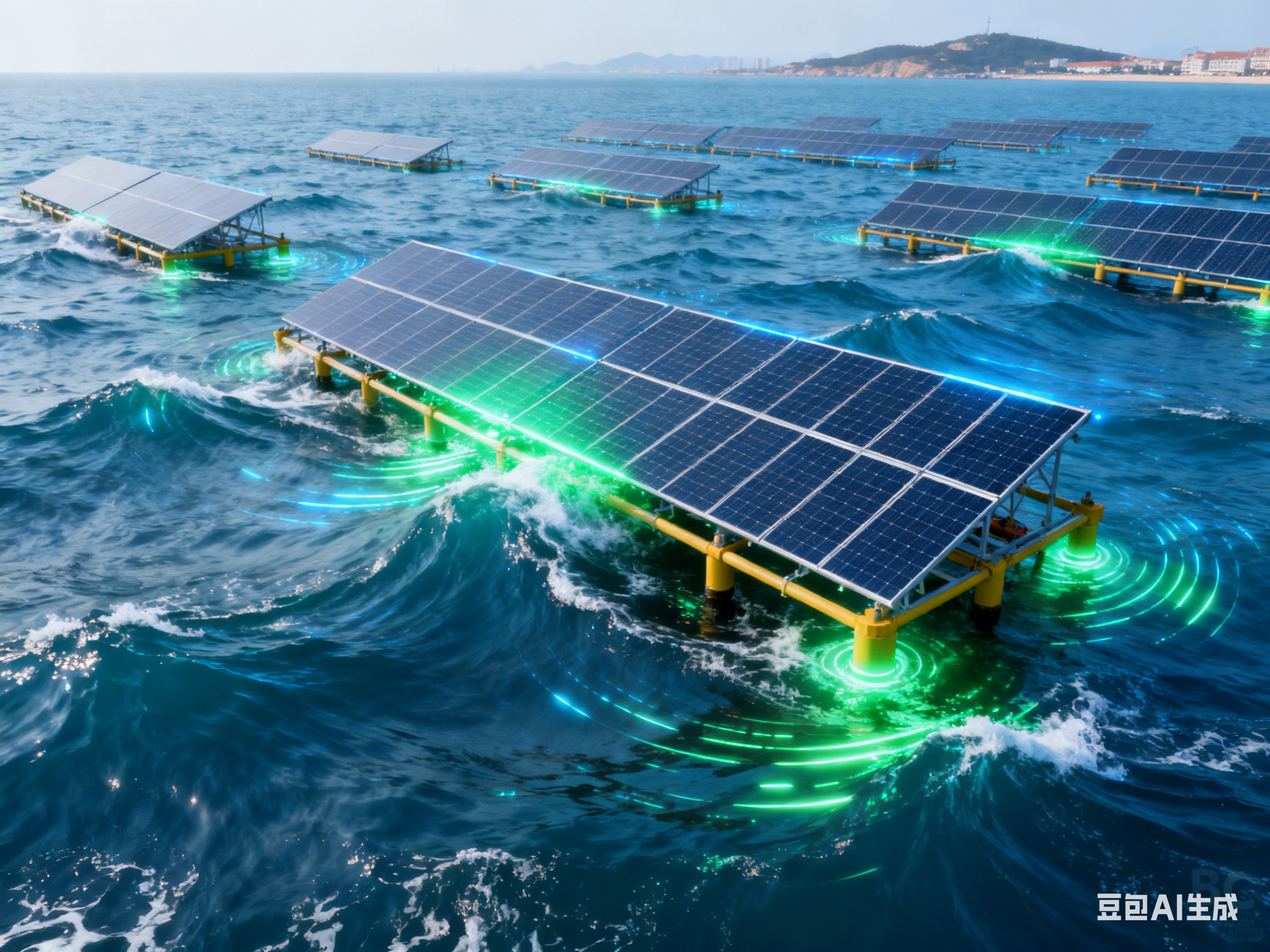 在波涛汹涌的东海海域,一块块光伏组件正随着波浪轻轻起伏,将强烈的海洋阳光转化为绿色电能,为我国能源转型注入新动力。
